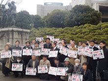 当日夕方4時から、弁護士有志の方々による一般メディア向けの記者会見が行われました。この様子は「ニコニコ動画」さんで生中継されました。その他にキー局の報道カメラが5台。報道記者や一般の方で、用意されていた60席はすぐに満席となり、通路にも椅子を並べ、立ち見も出るほどでした。参加された皆さんは、各地から来られた弁護士による説明・訴えを、熱心にメモをとりながら聴いていらっしゃいました。