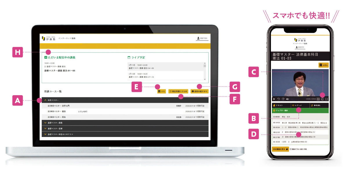 - 動作環境を満たした端末でも、端末の仕様やソフトなどの個別の環境、その他、OSやソフトウェアのバージョンアップ等により、視聴画面に不具合が生じる可能性がございます。このような場合、伊藤塾では改善、不具合解消のための対応、ご案内に限度がございますのでご了承ください。
